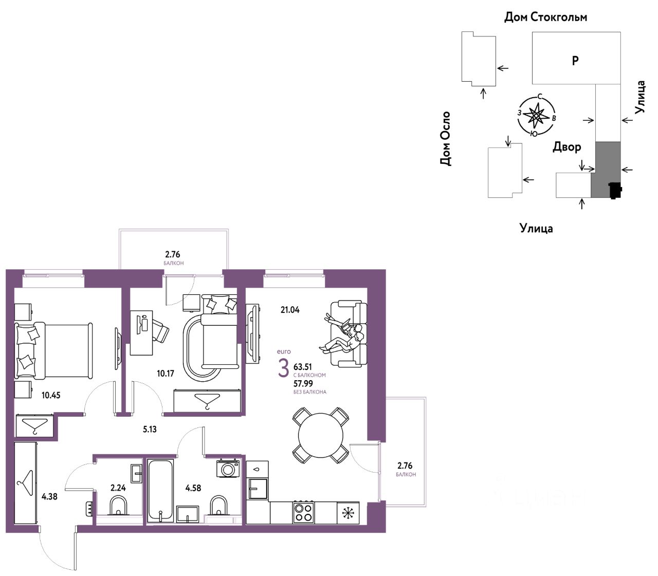 Продается 3комнатная квартира на 8 этаже от застройщика Страна Девелопмент. Площадь квартиры 63,51 кв. м.