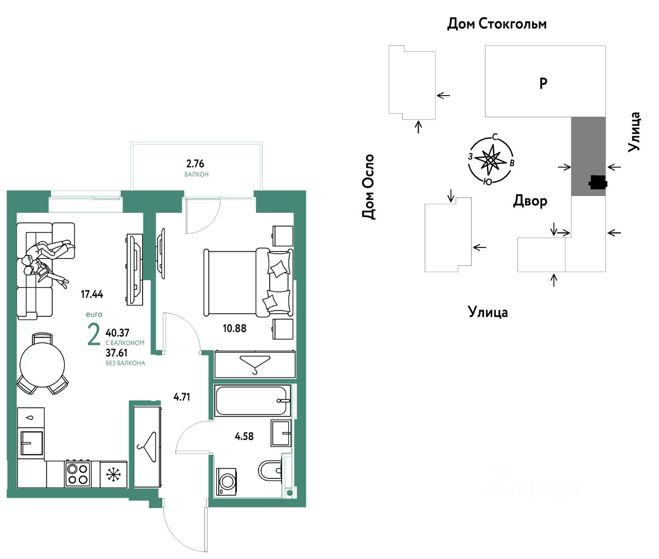 Продается 2комнатная квартира на 11 этаже от застройщика Страна Девелопмент. Площадь квартиры 40,37 кв. м.
