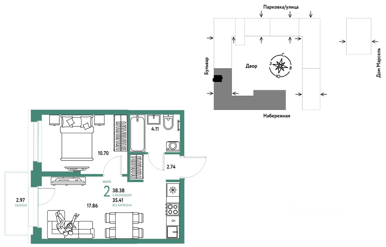 Продается 2комнатная квартира на 4 этаже от застройщика Страна Девелопмент. Площадь квартиры 38,38 кв. м. Стоимость указана без учета акций.