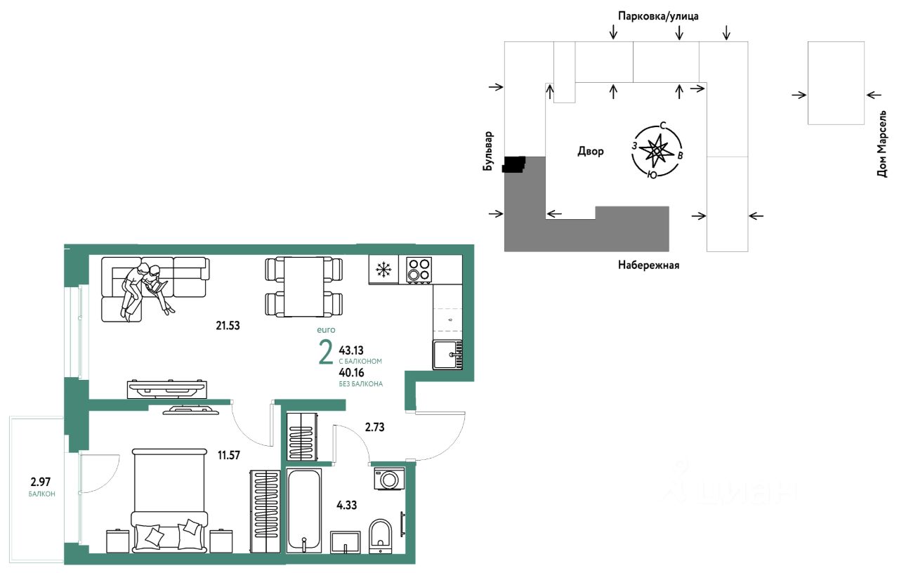 Продается 2комнатная квартира на 5 этаже от застройщика Страна Девелопмент. Площадь квартиры 43,13 кв. м. Стоимость указана без учета акций.