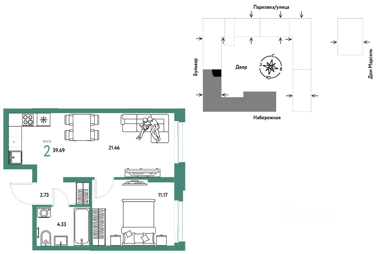 Продается 2комнатная квартира на 5 этаже от застройщика Страна Девелопмент. Площадь квартиры 39,69 кв. м. Стоимость указана без учета акций.