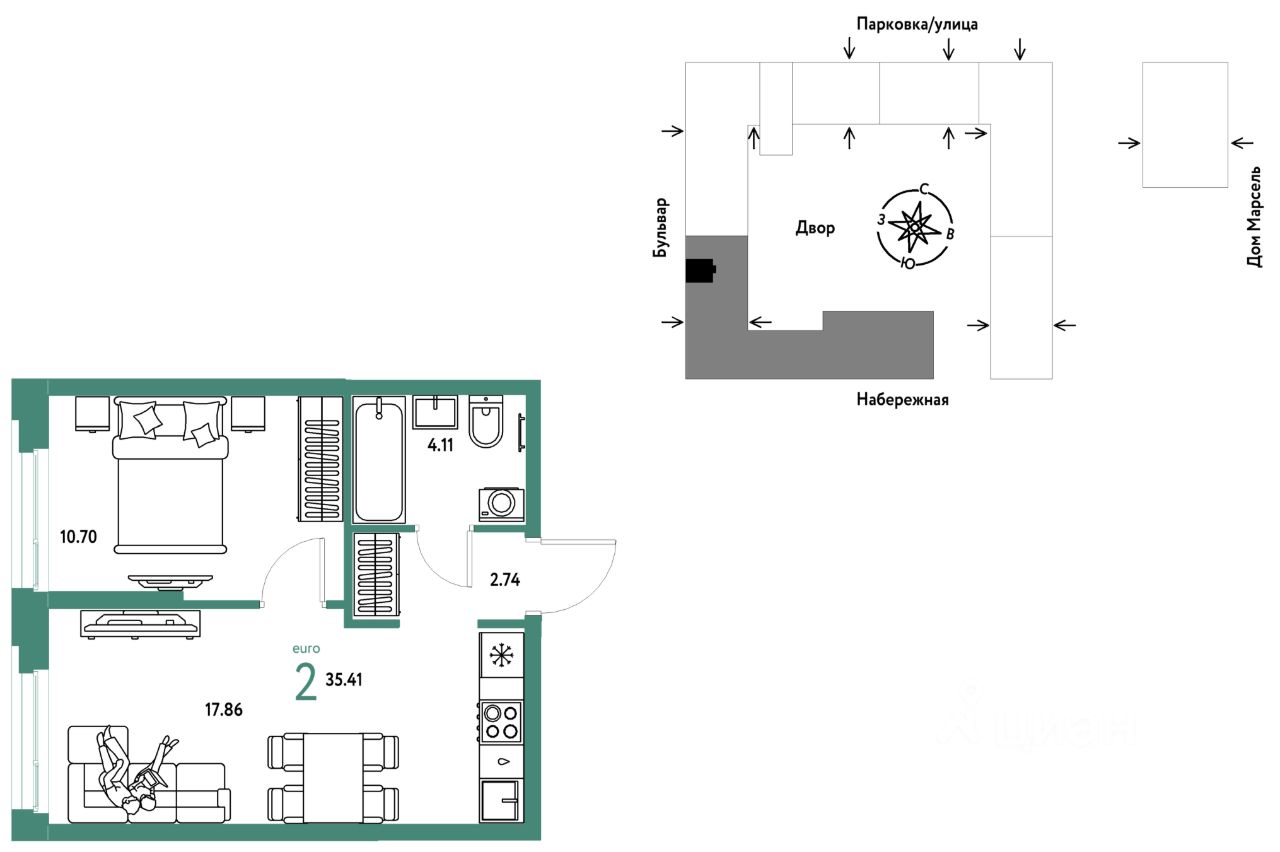 Продается 2комнатная квартира на 7 этаже от застройщика Страна Девелопмент. Площадь квартиры 35,41 кв. м. Стоимость указана без учета акций.