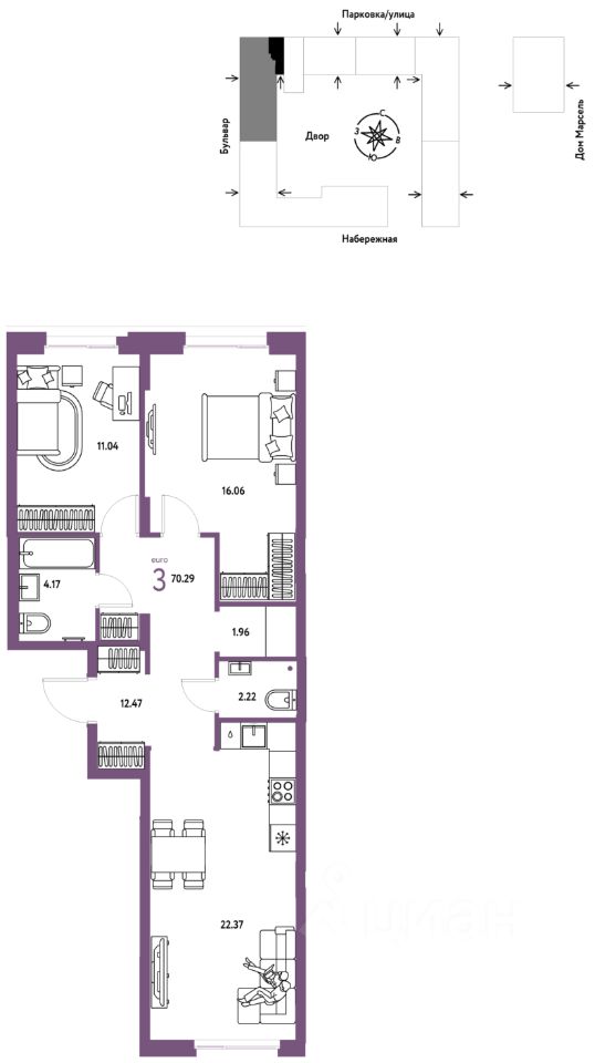 Продается 3комнатная квартира на 6 этаже от застройщика Страна Девелопмент. Площадь квартиры 70,29 кв. м. Стоимость указана без учета акций.