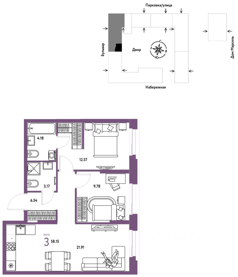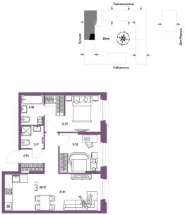 Продается 3комнатная квартира на 7 этаже от застройщика Страна Девелопмент. Площадь квартиры 58,15 кв. м. Стоимость указана без учета акций.