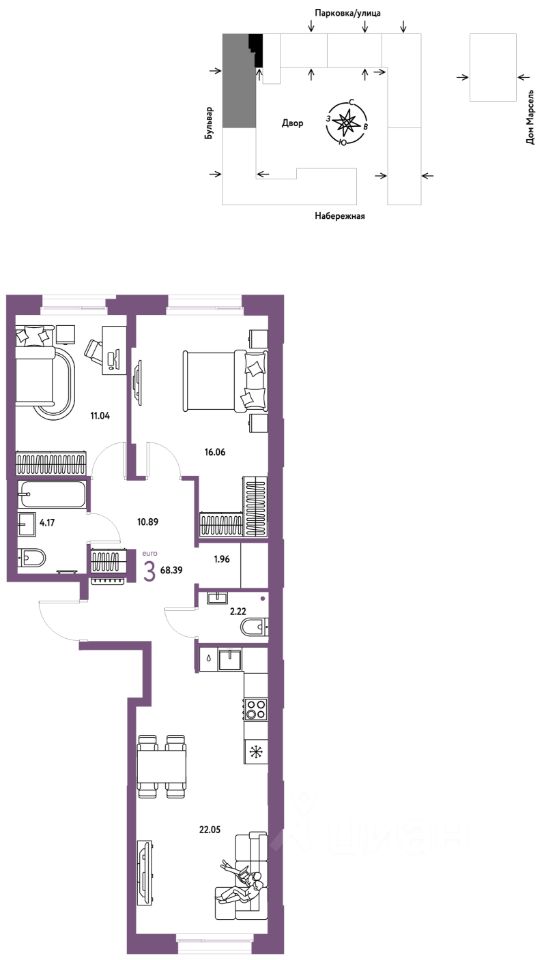 Продается 3комнатная квартира на 10 этаже от застройщика Страна Девелопмент. Площадь квартиры 68,39 кв. м. Стоимость указана без учета акций.