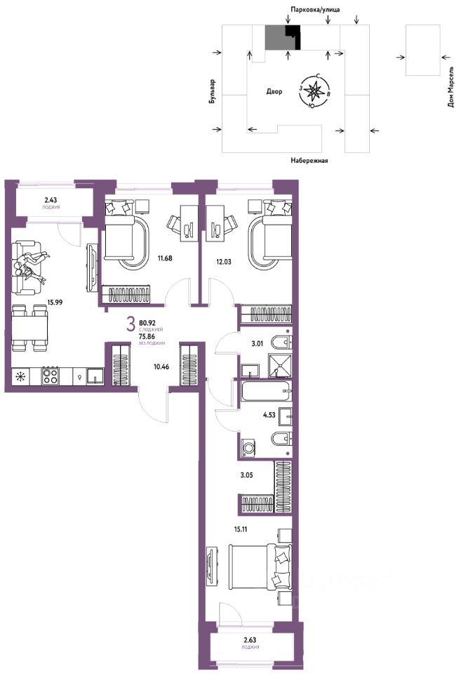 Продается 3комнатная квартира на 14 этаже от застройщика Страна Девелопмент. Площадь квартиры 80,92 кв. м. Стоимость указана без учета акций.