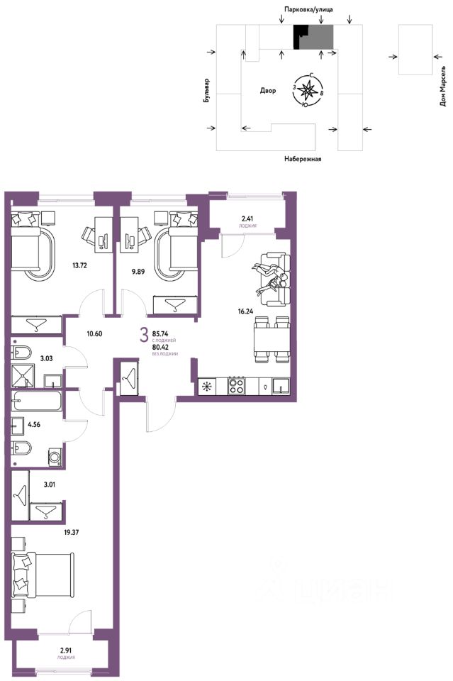 Продается 3комнатная квартира на 2 этаже от застройщика Страна Девелопмент. Площадь квартиры 85,74 кв. м. Стоимость указана без учета акций.