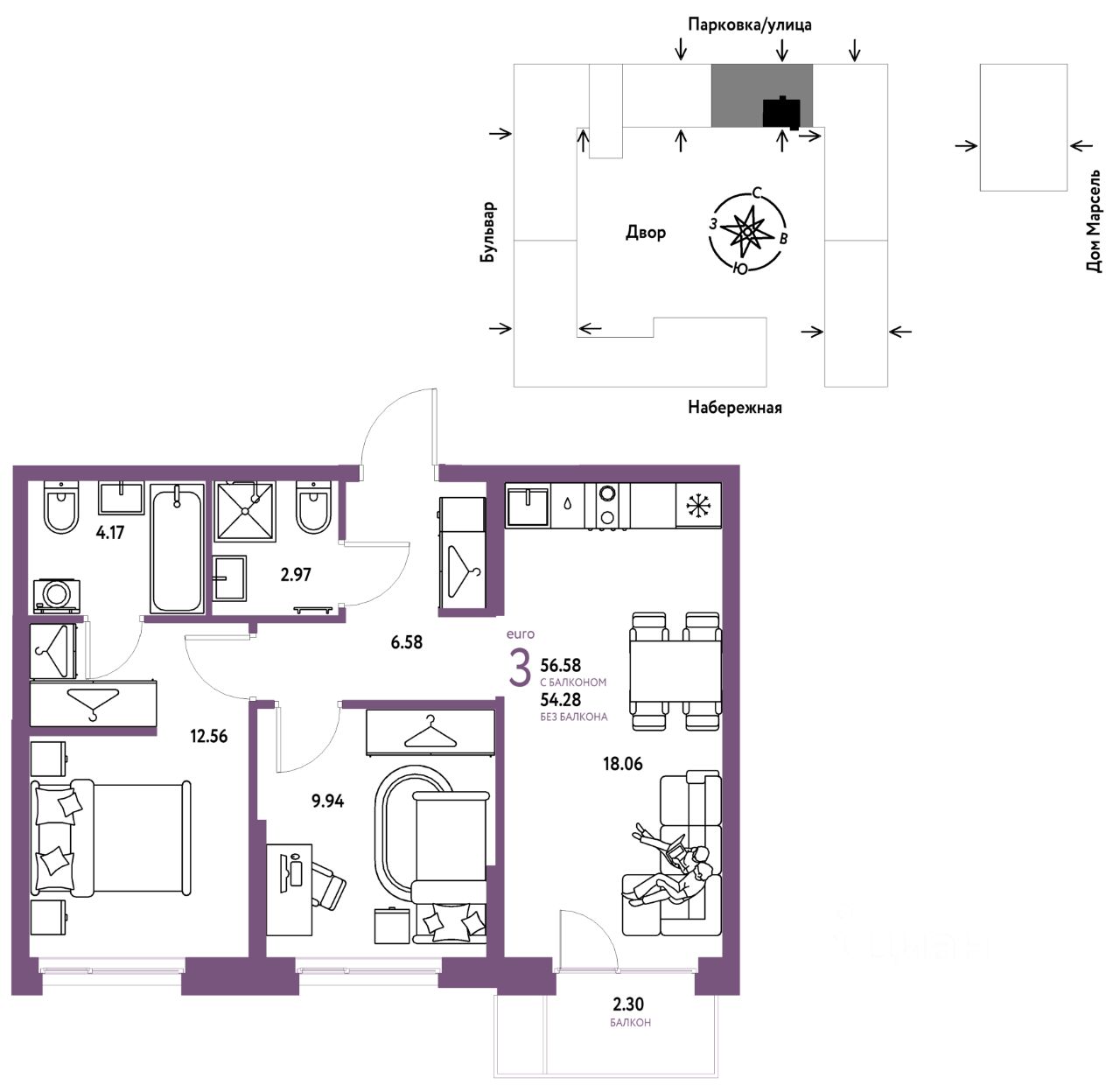 Продается 3комнатная квартира на 3 этаже от застройщика Страна Девелопмент. Площадь квартиры 56,58 кв. м. Стоимость указана без учета акций.