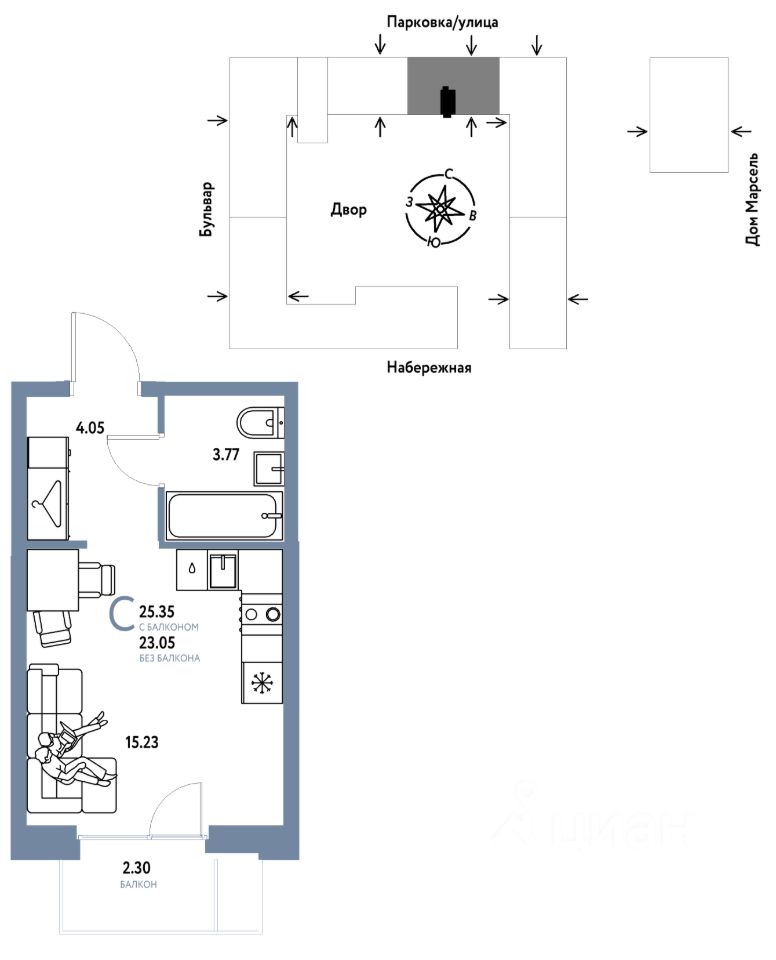 Продается 1комнатная квартира на 7 этаже от застройщика Страна Девелопмент. Площадь квартиры 25,35 кв. м. Стоимость указана без учета акций.