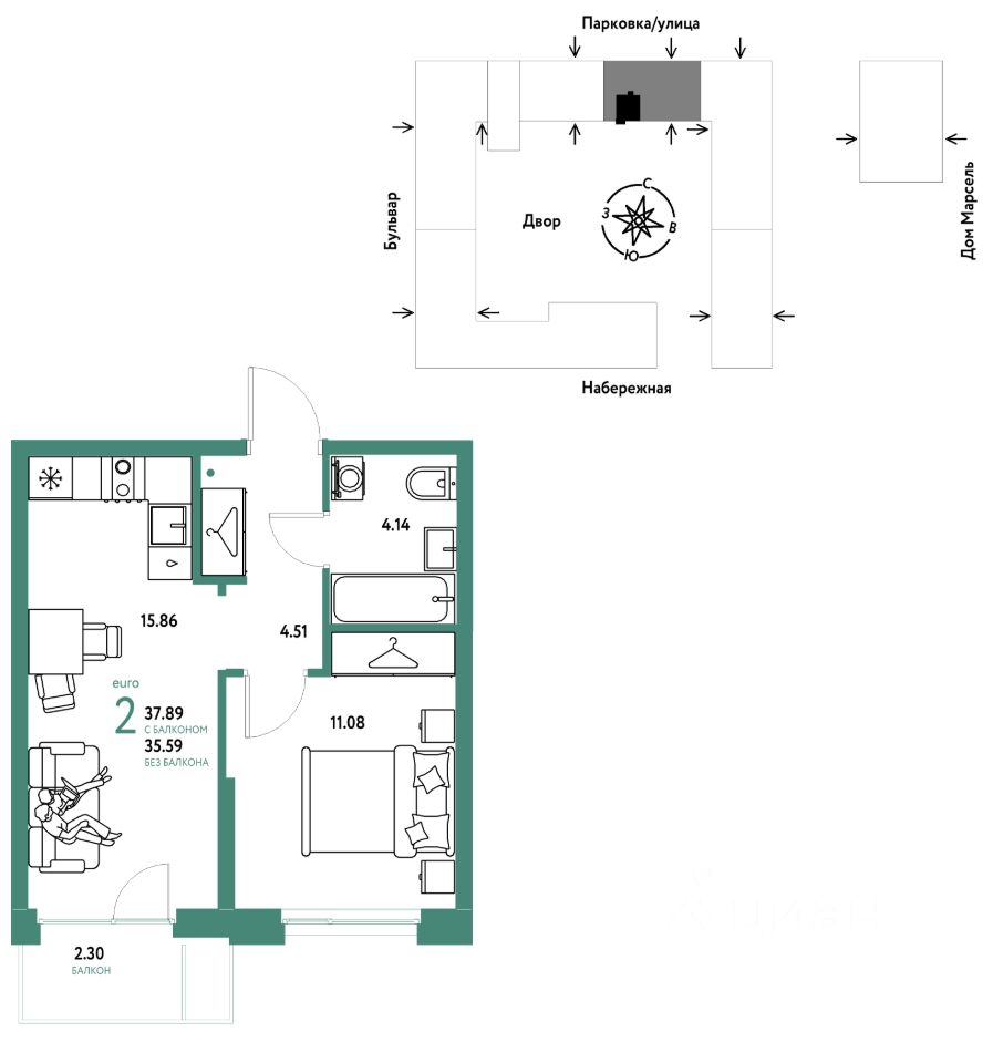 Продается 2комнатная квартира на 7 этаже от застройщика Страна Девелопмент. Площадь квартиры 37,89 кв. м. Стоимость указана без учета акций.