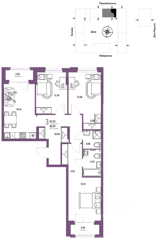 Продается 3комнатная квартира на 9 этаже от застройщика Страна Девелопмент. Площадь квартиры 87,39 кв. м. Стоимость указана без учета акций.