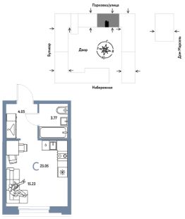 Продается 1комнатная квартира на 10 этаже от застройщика Страна Девелопмент. Площадь квартиры 23,05 кв. м. Стоимость указана без учета акций.