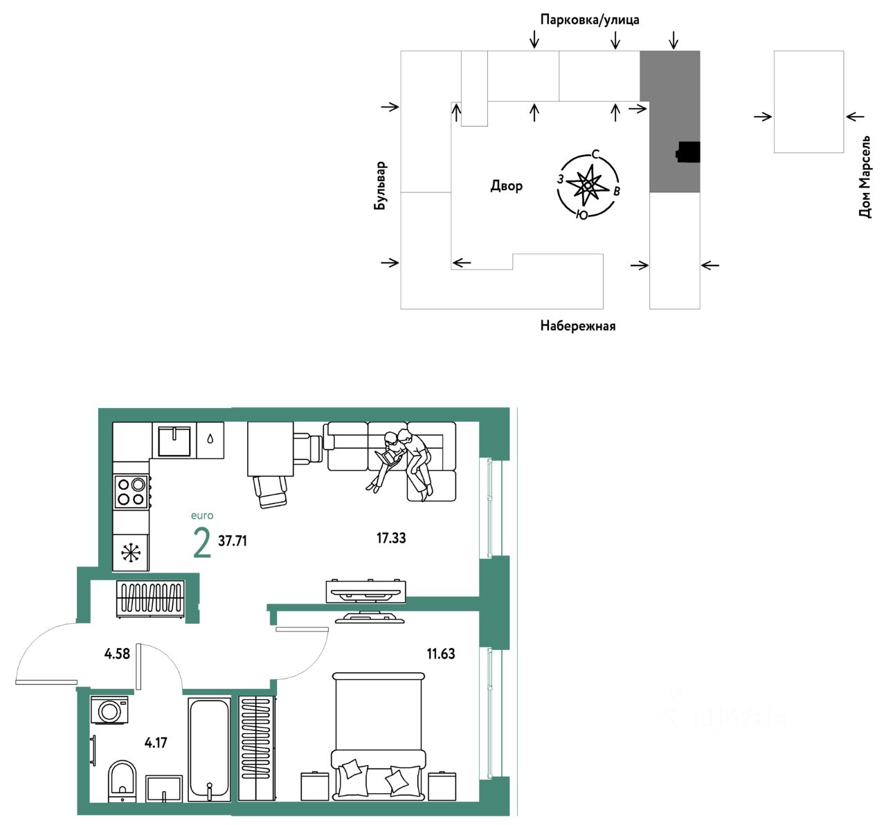 Продается 2комнатная квартира на 6 этаже от застройщика Страна Девелопмент. Площадь квартиры 37,71 кв. м. Стоимость указана без учета акций.