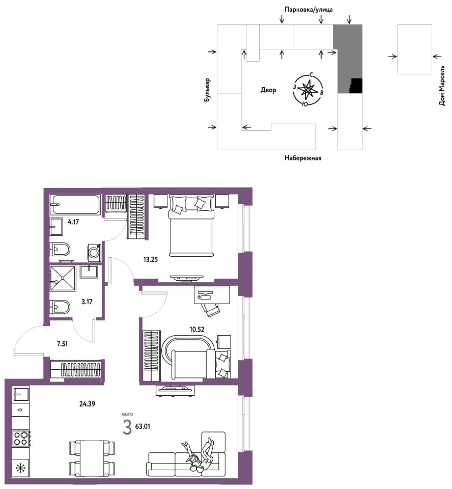 Продается 3комнатная квартира на 6 этаже от застройщика Страна Девелопмент. Площадь квартиры 63,01 кв. м. Стоимость указана без учета акций.