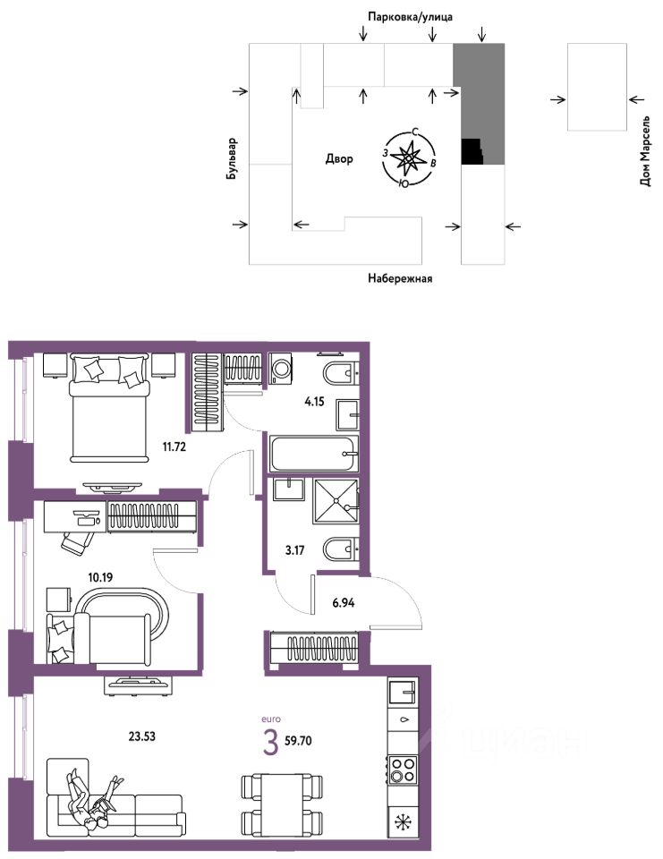 Продается 3комнатная квартира на 6 этаже от застройщика Страна Девелопмент. Площадь квартиры 59,7 кв. м. Стоимость указана без учета акций.