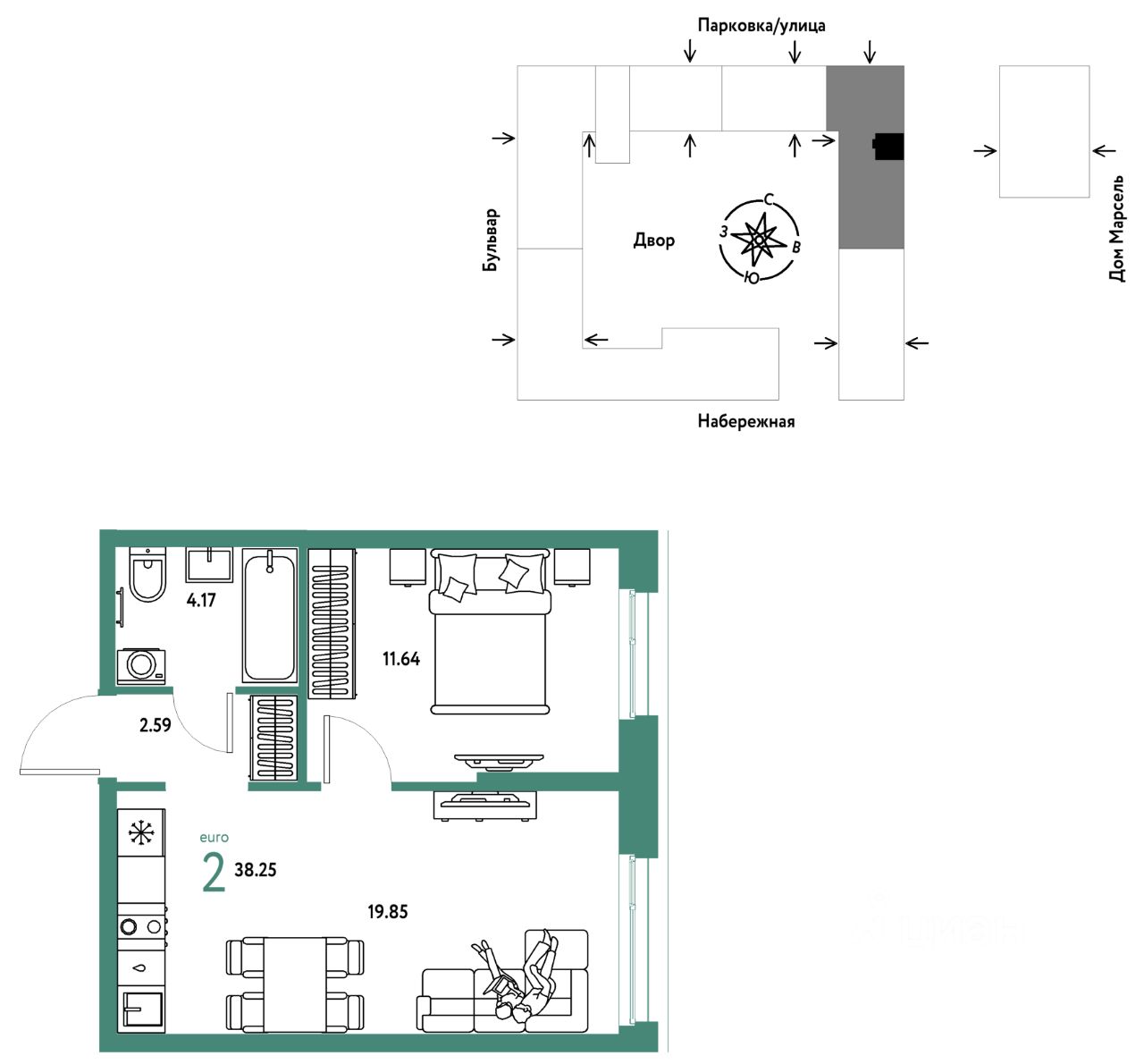 Продается 2комнатная квартира на 7 этаже от застройщика Страна Девелопмент. Площадь квартиры 38,25 кв. м. Стоимость указана без учета акций.