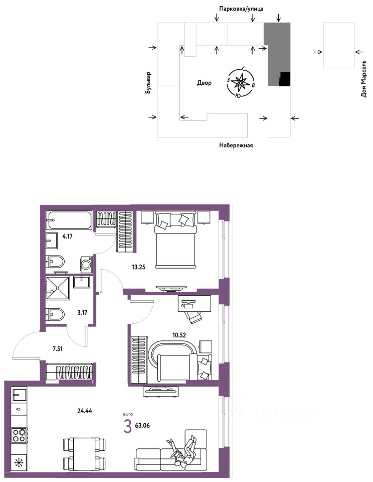 Продается 3комнатная квартира на 11 этаже от застройщика Страна Девелопмент. Площадь квартиры 63,06 кв. м. Стоимость указана без учета акций.