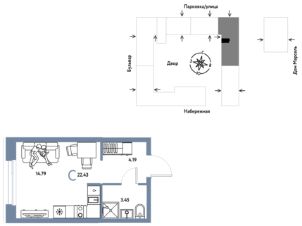 Продается 1комнатная квартира на 12 этаже от застройщика Страна Девелопмент. Площадь квартиры 22,43 кв. м. Стоимость указана без учета акций.