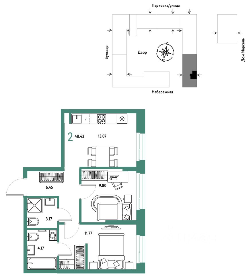 Продается 2комнатная квартира на 9 этаже от застройщика Страна Девелопмент. Площадь квартиры 48,43 кв. м. Стоимость указана без учета акций.
