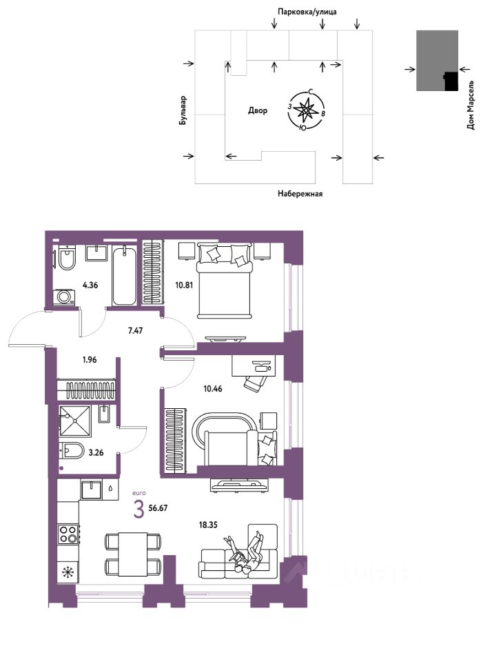 Продается 3комнатная квартира на 2 этаже от застройщика Страна Девелопмент. Площадь квартиры 56,67 кв. м. Стоимость указана без учета акций.