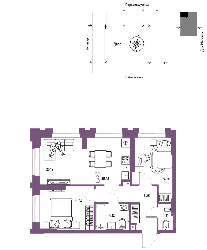 Продается 3комнатная квартира на 2 этаже от застройщика Страна Девелопмент. Площадь квартиры 55,45 кв. м. Стоимость указана без учета акций.