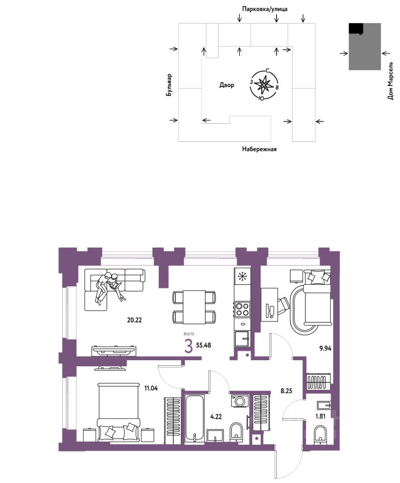 Продается 3комнатная квартира на 3 этаже от застройщика Страна Девелопмент. Площадь квартиры 55,48 кв. м. Стоимость указана без учета акций.