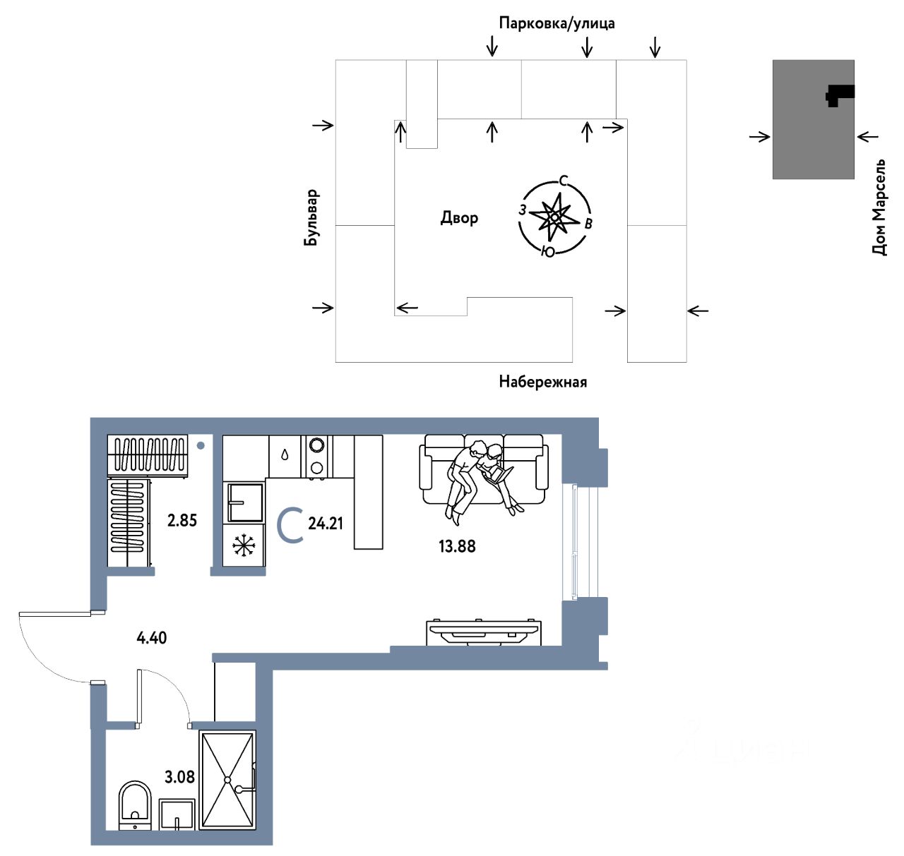 Продается 1комнатная квартира на 4 этаже от застройщика Страна Девелопмент. Площадь квартиры 24,21 кв. м. Стоимость указана без учета акций.