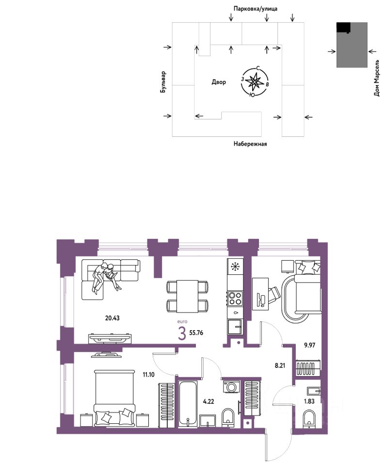 Продается 3комнатная квартира на 6 этаже от застройщика Страна Девелопмент. Площадь квартиры 55,76 кв. м. Стоимость указана без учета акций.