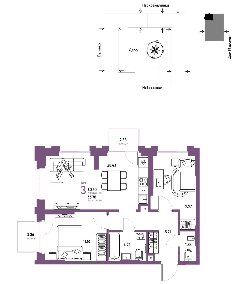 Продается 3комнатная квартира на 7 этаже от застройщика Страна Девелопмент. Площадь квартиры 60,5 кв. м. Стоимость указана без учета акций.