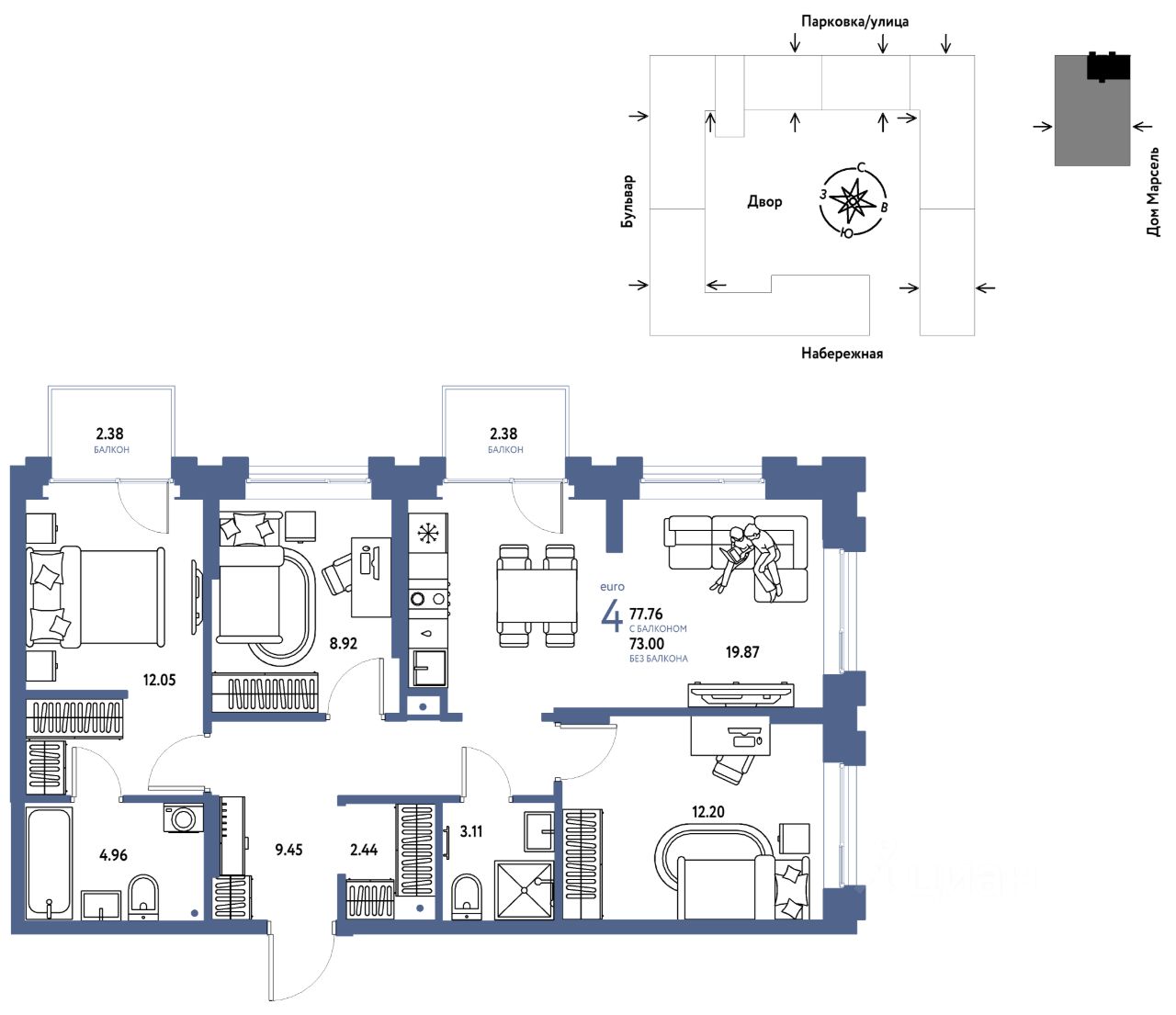 Продается 4комнатная квартира на 9 этаже от застройщика Страна Девелопмент. Площадь квартиры 77,76 кв. м. Стоимость указана без учета акций.