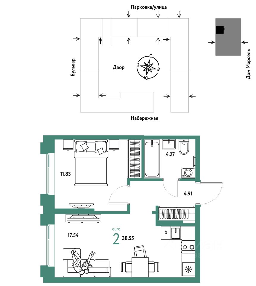 Продается 2комнатная квартира на 12 этаже от застройщика Страна Девелопмент. Площадь квартиры 38,55 кв. м. Стоимость указана без учета акций.