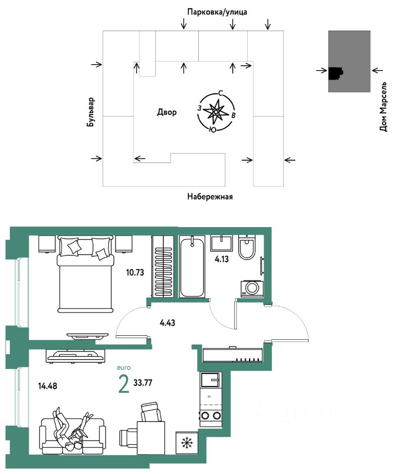 Продается 2комнатная квартира на 20 этаже от застройщика Страна Девелопмент. Площадь квартиры 33,77 кв. м. Стоимость указана без учета акций.
