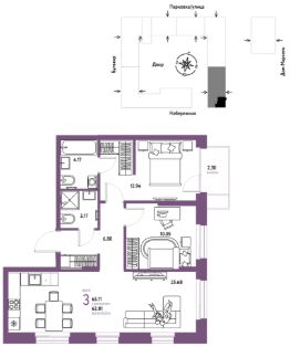 Продается 3комнатная квартира на 11 этаже от застройщика Страна Девелопмент. Площадь квартиры 65,11 кв. м. Стоимость указана без учета акций.