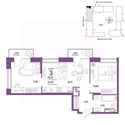 Продается 3комнатная квартира в новом ЖК "Европейский берег". Общая площадь квартиры 50,67 кв. м. Сдача — в 4 квартале 2025 года.