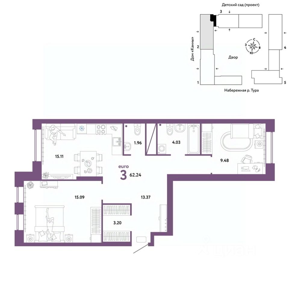 Продается 3комнатная квартира в новом ЖК "Европейский берег". Общая площадь квартиры 62,24 кв. м. Сдача — в 4 квартале 2025 года.