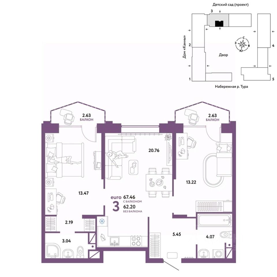 Продается 3комнатная квартира в новом ЖК "Европейский берег". Общая площадь квартиры 67,46 кв. м. Сдача — в 4 квартале 2025 года.