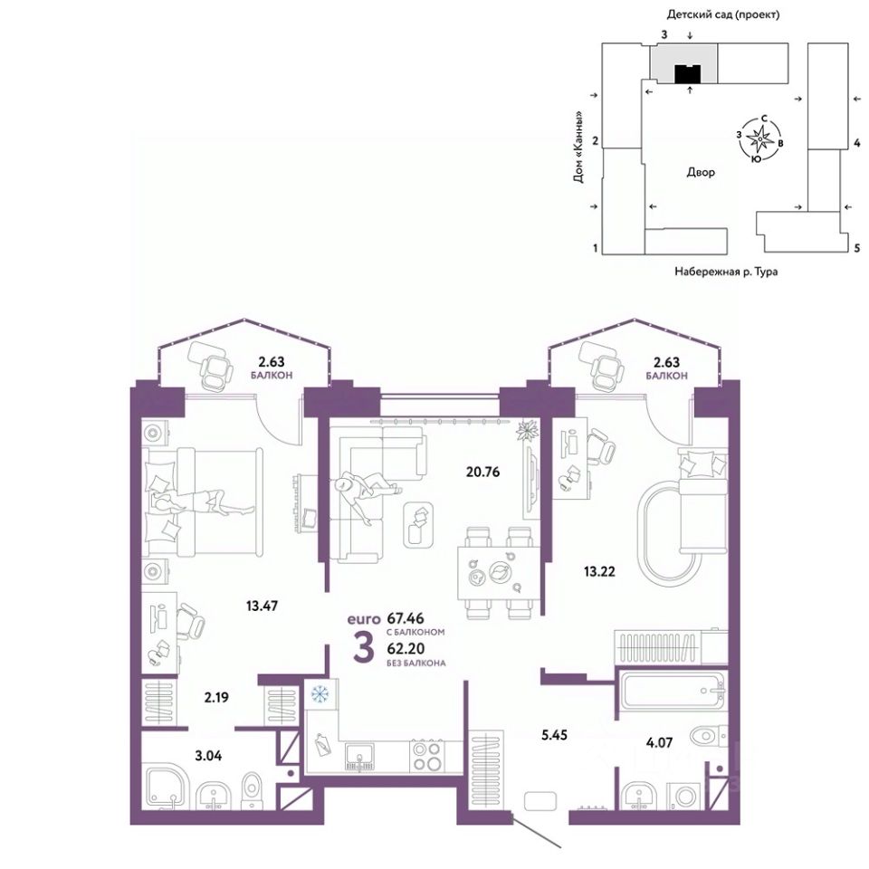 Продается 3комнатная квартира в новом ЖК "Европейский берег". Общая площадь квартиры 67,46 кв. м. Сдача — в 4 квартале 2025 года.