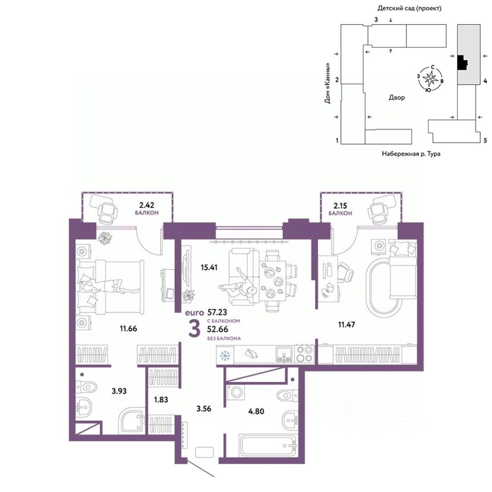 Продается 3комнатная квартира в новом ЖК "Европейский берег". Общая площадь квартиры 57,23 кв. м. Сдача — в 4 квартале 2025 года.