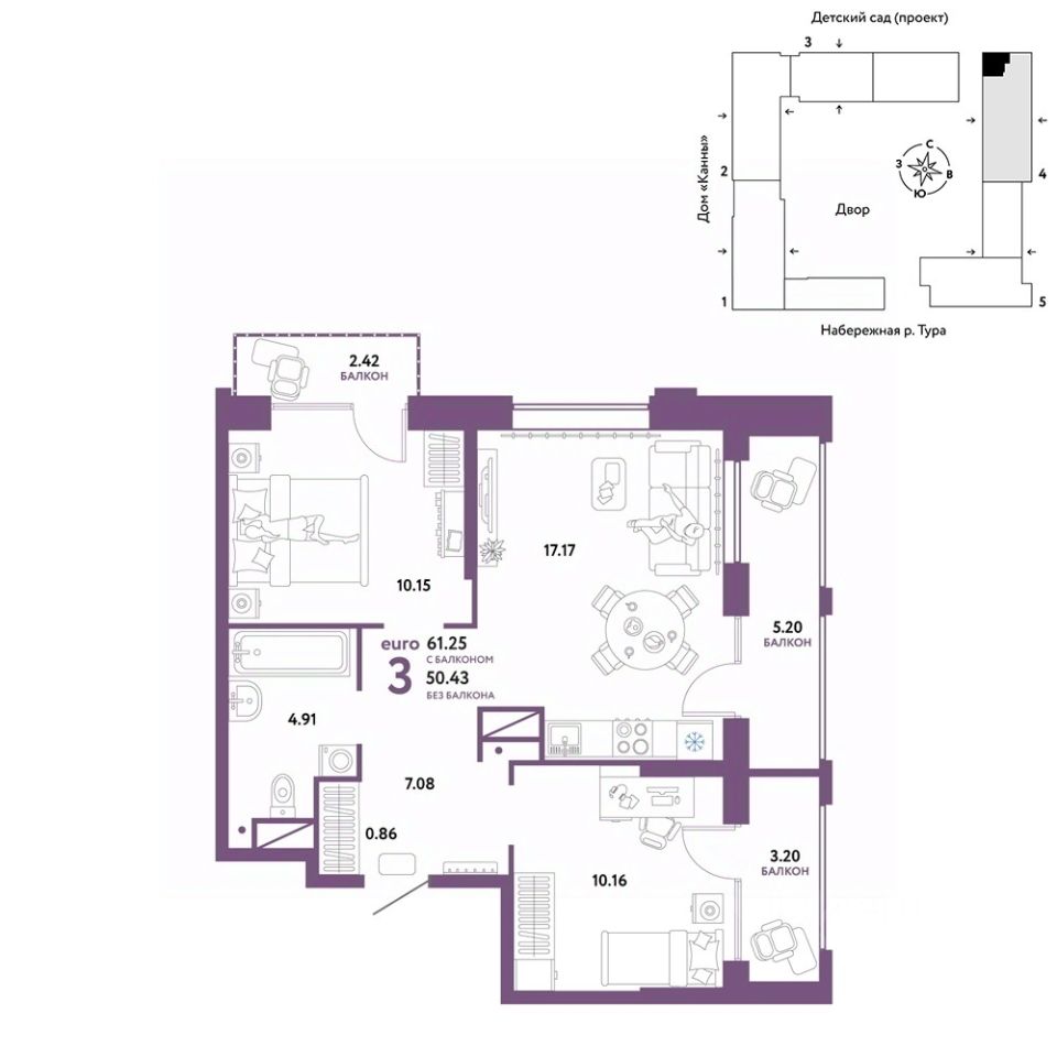 Продается 3комнатная квартира в новом ЖК "Европейский берег". Общая площадь квартиры 61,25 кв. м. Сдача — в 4 квартале 2025 года.