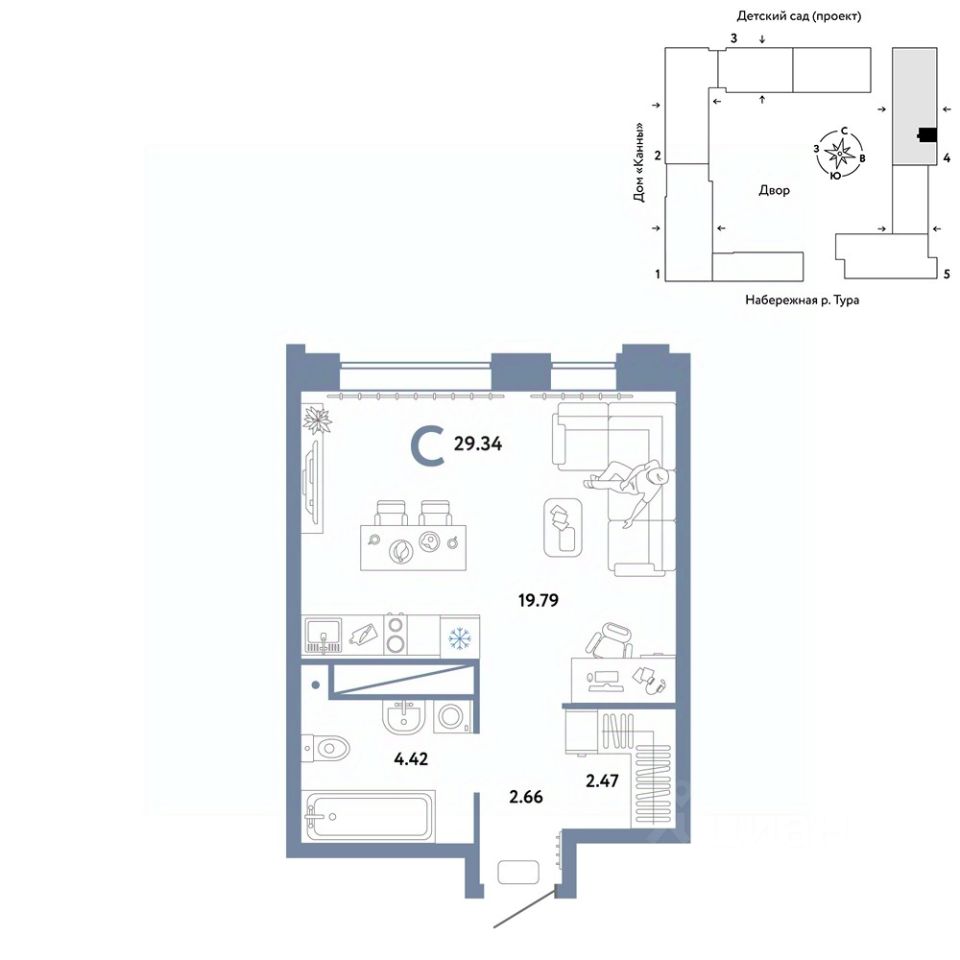 Продается 1комнатная квартира в новом ЖК "Европейский берег". Общая площадь квартиры 29,34 кв. м. Сдача — в 4 квартале 2025 года.