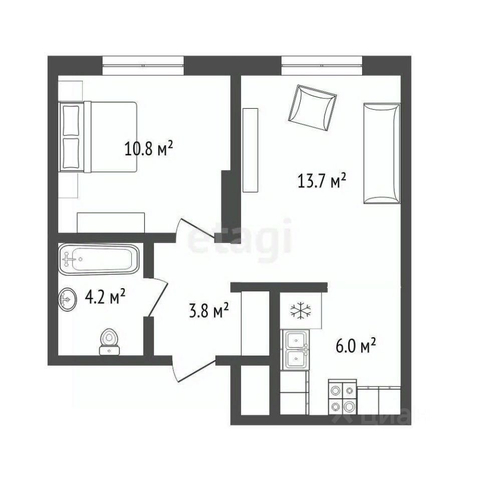 Высота потолков 2,7 метра и множество окон в просторной кухне-гостиной наполняют квартиру светом и создают ощущение простора. Здесь вы сможете наслаждаться утренним кофе, любуясь солнечными лучами, проникающими в ваш новый дом.