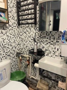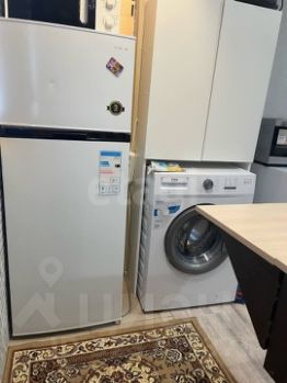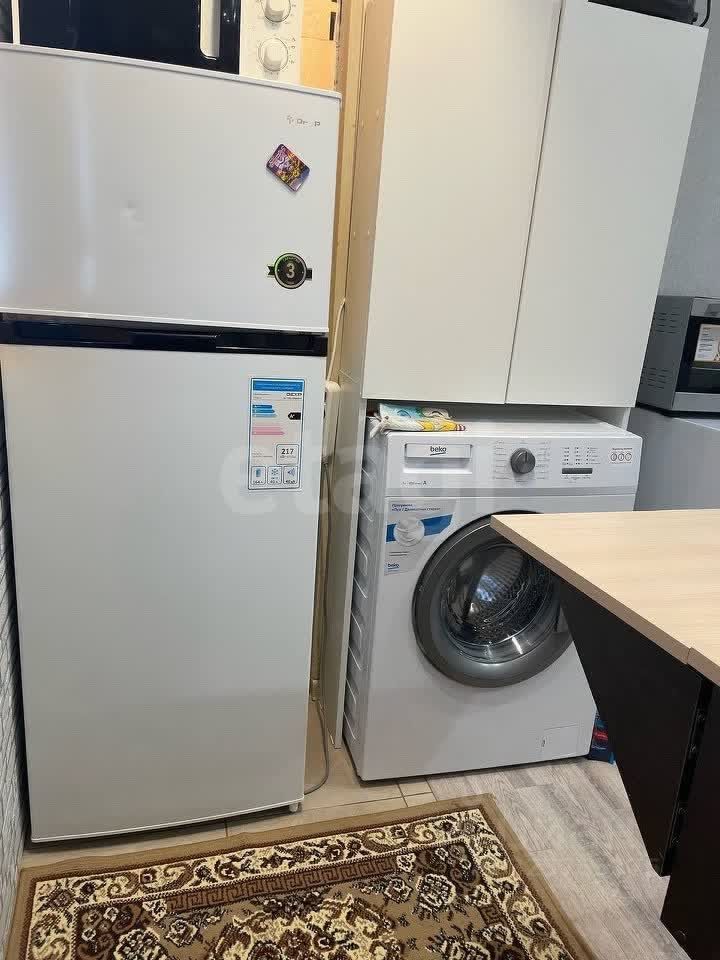 При продаже студии в стоимость входит современный кухонный гарнитур, холодильник, стиральная машина, диван, шкаф для хранения вещей и полотенцесушитель.