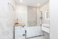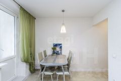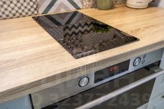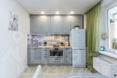 На кухне вместительный хороший кухонный гарнитур со встроенной техникой.