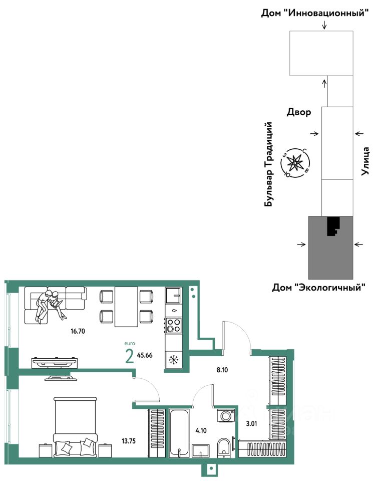 Продается 2комнатная квартира на 2 этаже от застройщика Страна Девелопмент. Площадь квартиры 45,66 кв. м.