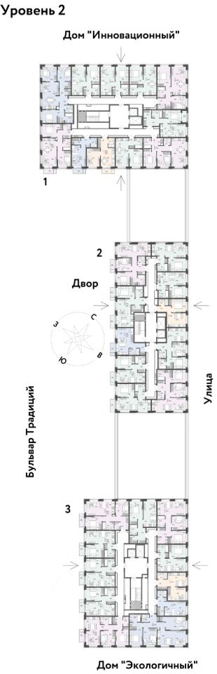 Внутри микрорайона появится огромный пешеходный бульвар — бульвар Традиций. Центром притяжения станут открытые пространства для отдыха жителей и гостей микрорайона, которые легко меняются под сезонные сценарии отдыха: новогодняя елка, ярмарки, кинопоказы и т.д.