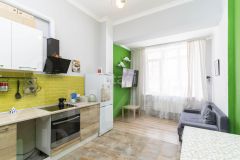 После продажи остается кухонный гарнитур, вытяжка, шкаф-купе, стеллаж под книги, двухспальная кровать.