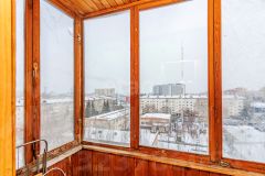 Балкон с остеклением и деревянной отделкой. Окна квартиры выходят во двор.