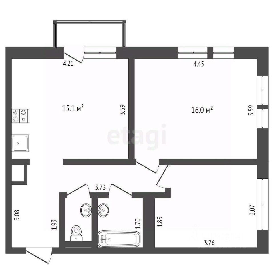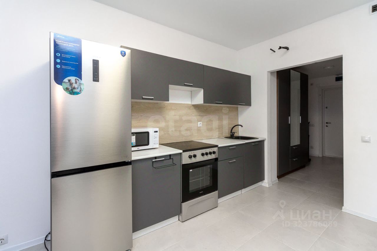 Кухня полностью укомплектована: варочная панель, духовой шкаф, холодильник.