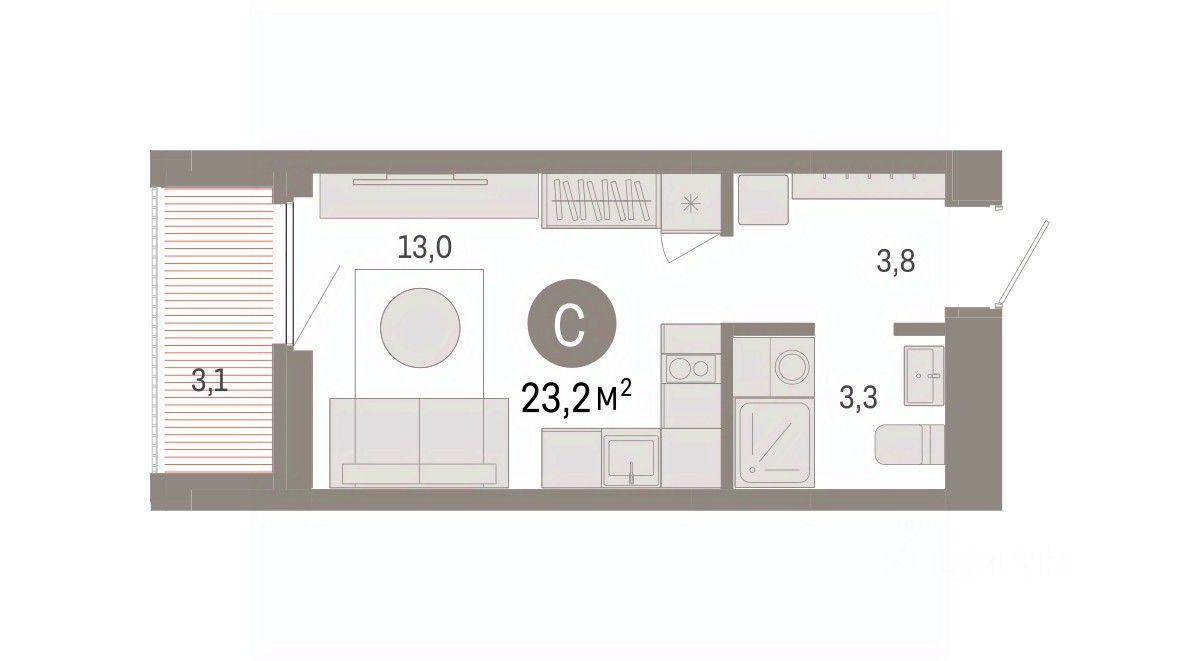 Студия в жилом районе "Зарека". Особенности планировки: лоджия, предчистовая отделка.