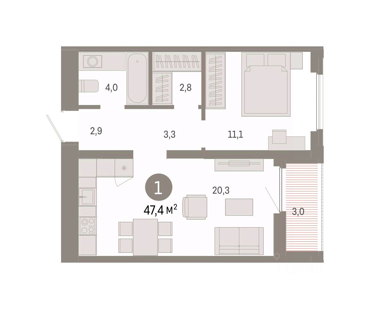 Квартира с кухней-гостиной и одной спальней в жилом районе "Зарека". Особенности планировки: гардеробная, лоджия, предчистовая отделка.